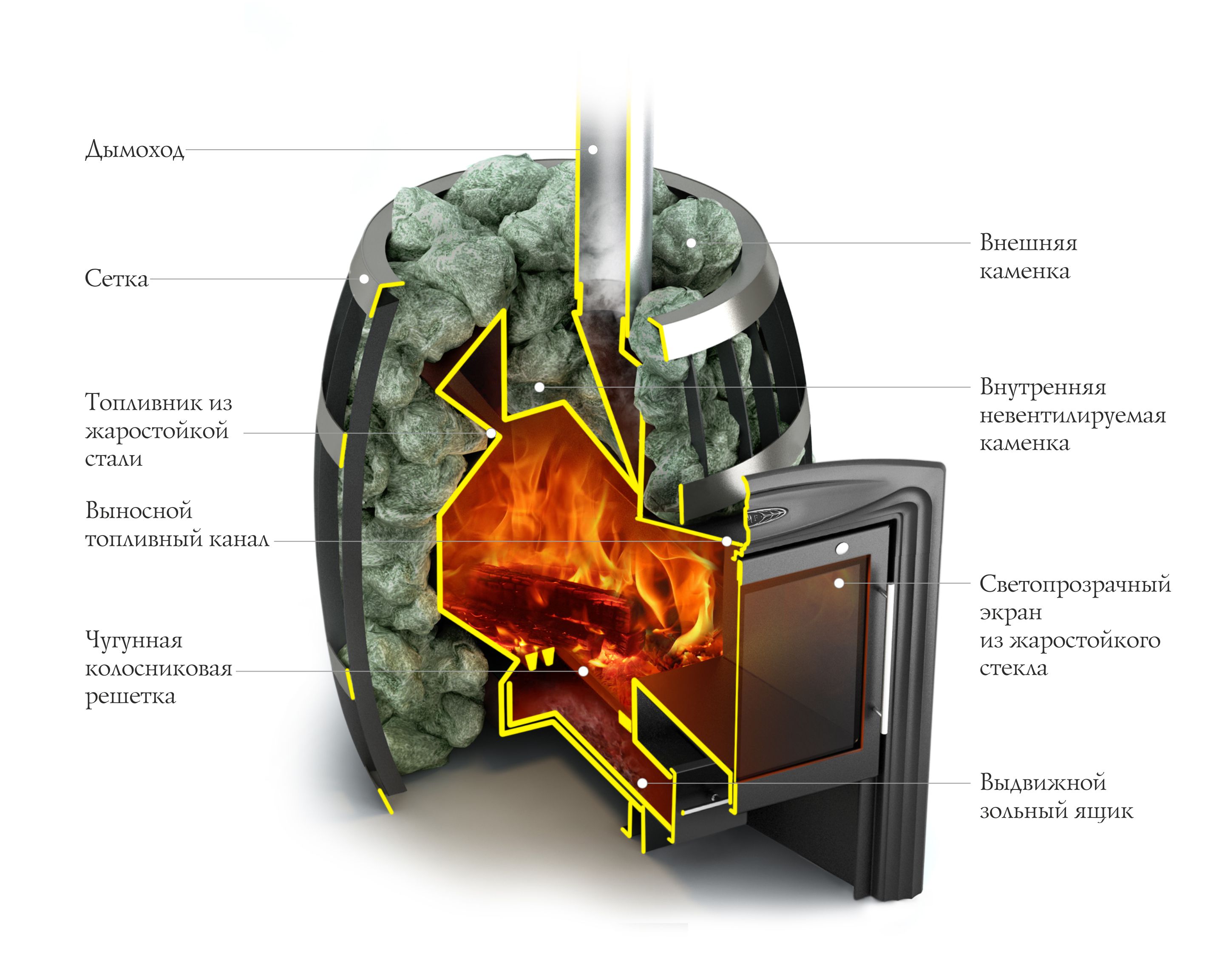 В обычных банных печах камни внутри, а печка снаружи. В печах-сетках всё наоборот: печка внутри, а камни снаружи.