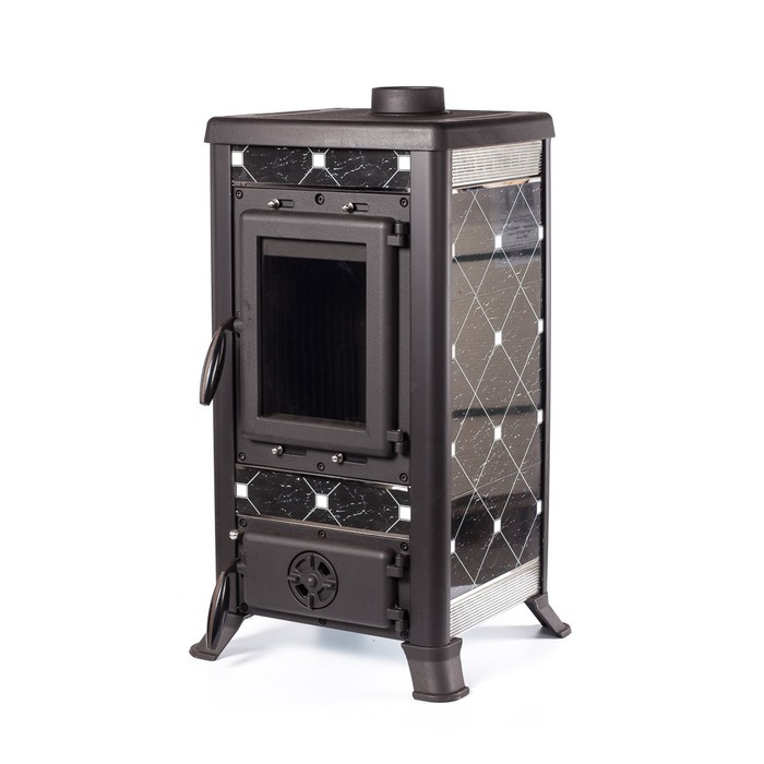 Тепловая мощность печи 8 кВт. КПД 75%. Систем длительного горения, работа в режиме тления до 8 часов. Система обдува стекла. Система дистанционного сброса золы с колосника. Загрузка дров фронтальная. Диаметр дымохода 120 мм. Расположение дымохода сверху. Отделка антрацит с керамическими вставками белого цвета. Размер стекла 313х221х4 mm.